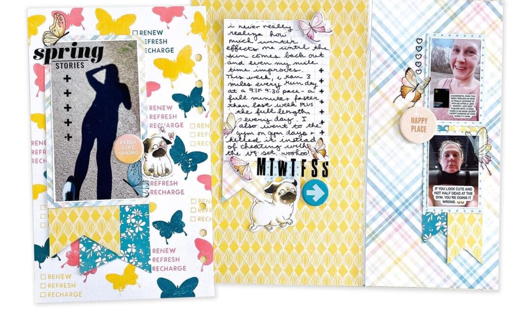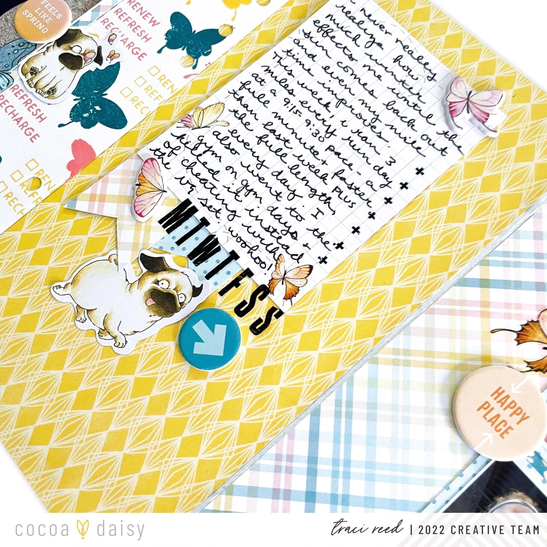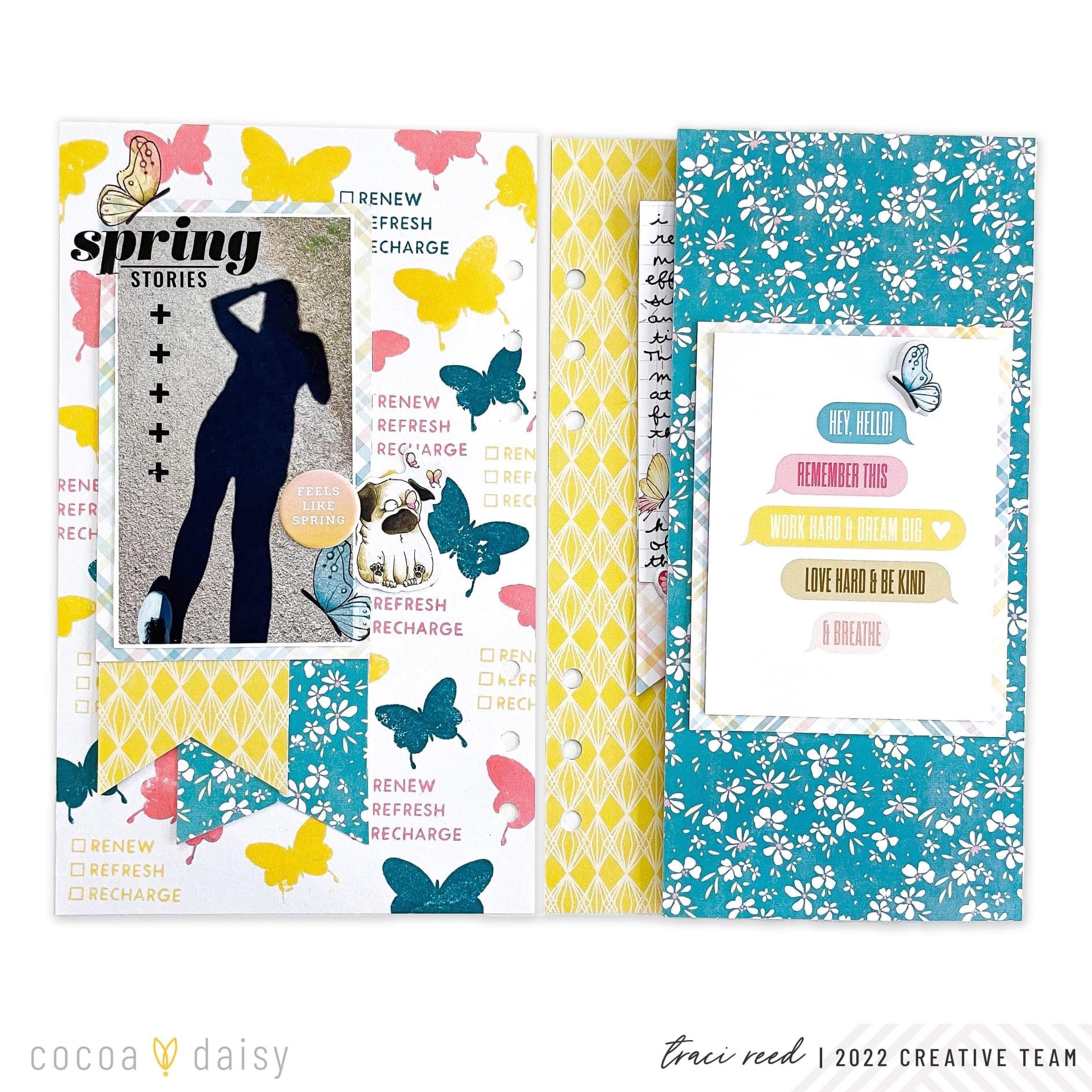 In order to not only carry butterflies throughout the page but make the stamped butterflies match the illustrated ones in the collection, I used rub ons and puffy stickers from the Meadow Modern Memory Keeping Kit in conjunction with the stamped paper to combine both butterfly styles into one seamless layout.