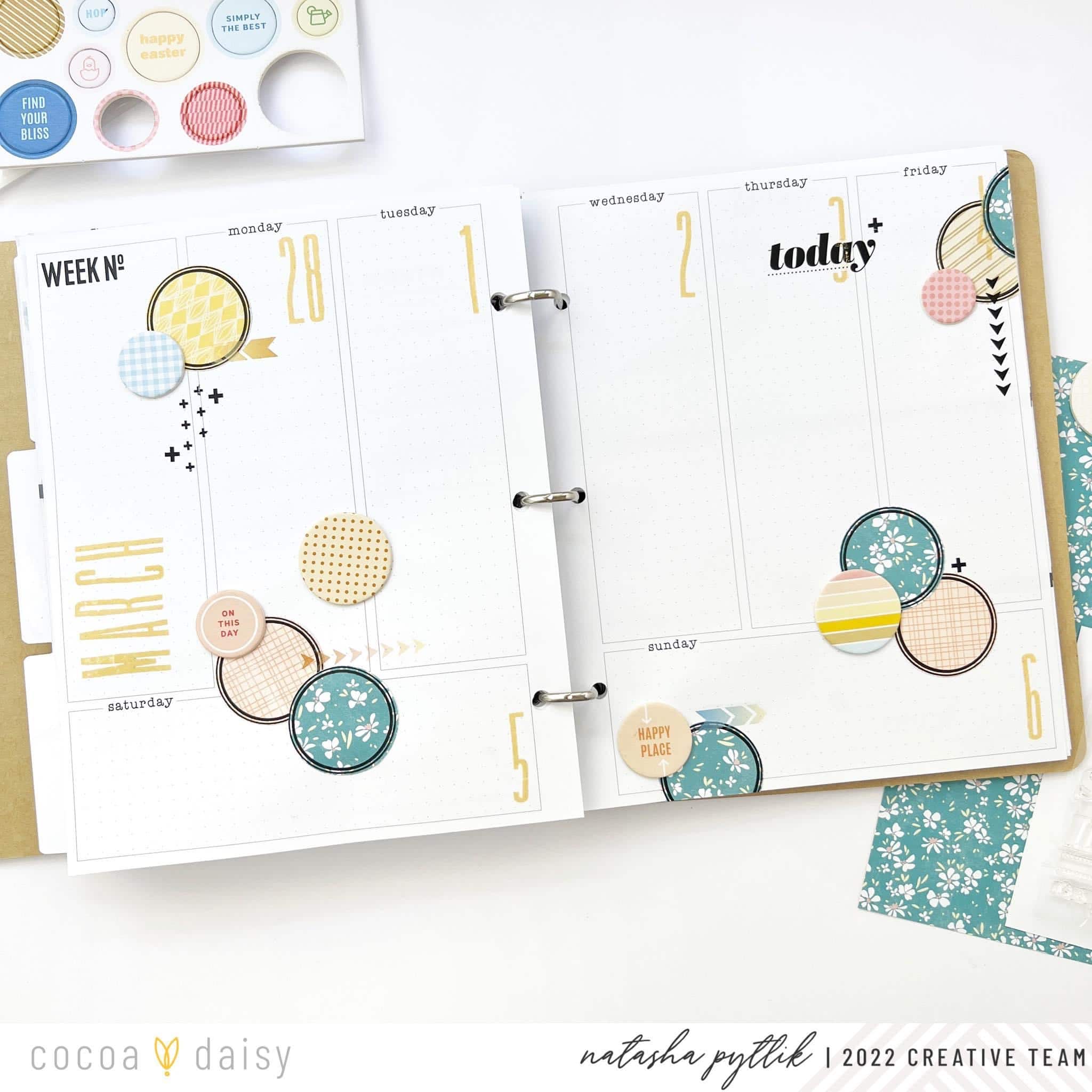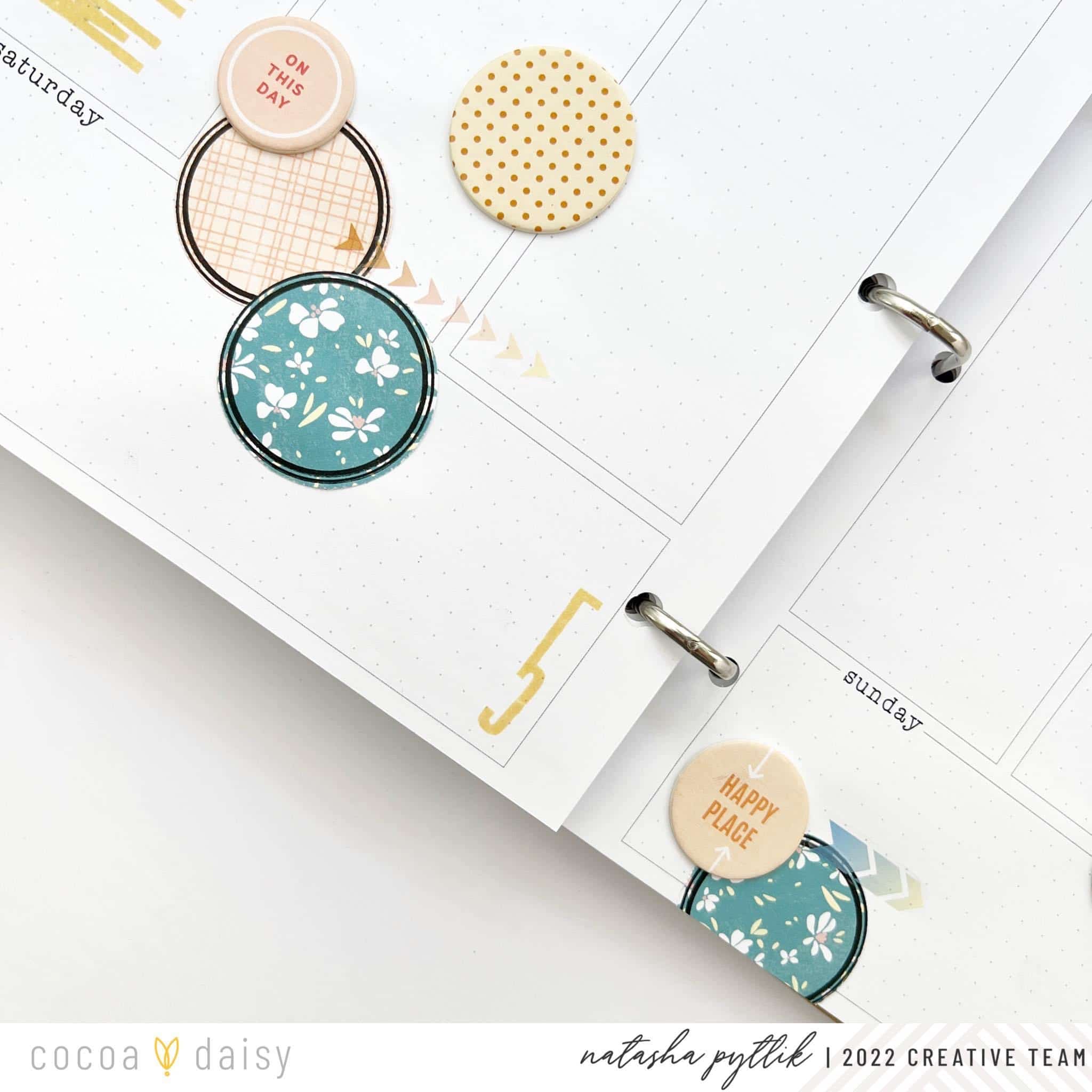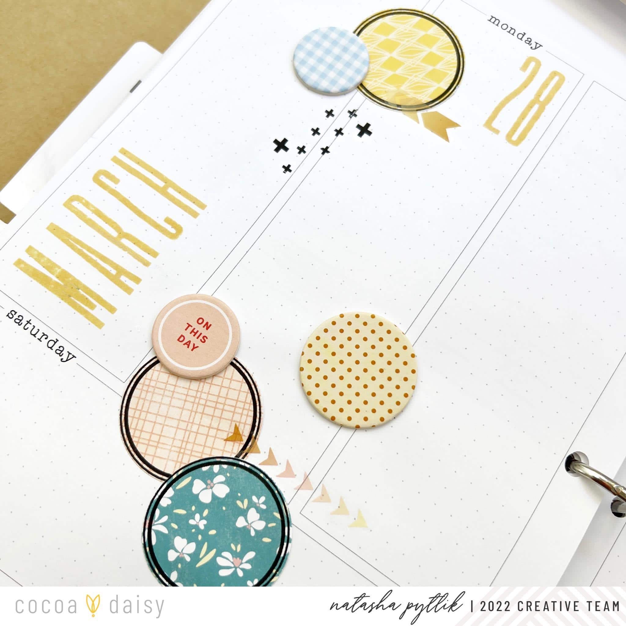 Circles are one of the repeated elements that stood out to me in the Meadows collection. Using the Meadow Travelers Notebook Memory Keeping Kit, I pulled the chipboard pieces and then the circle stamp from the same collection. Using the papers from the Simple Dori, which I took apart, I stamped the circle out on a few different patterned papers.