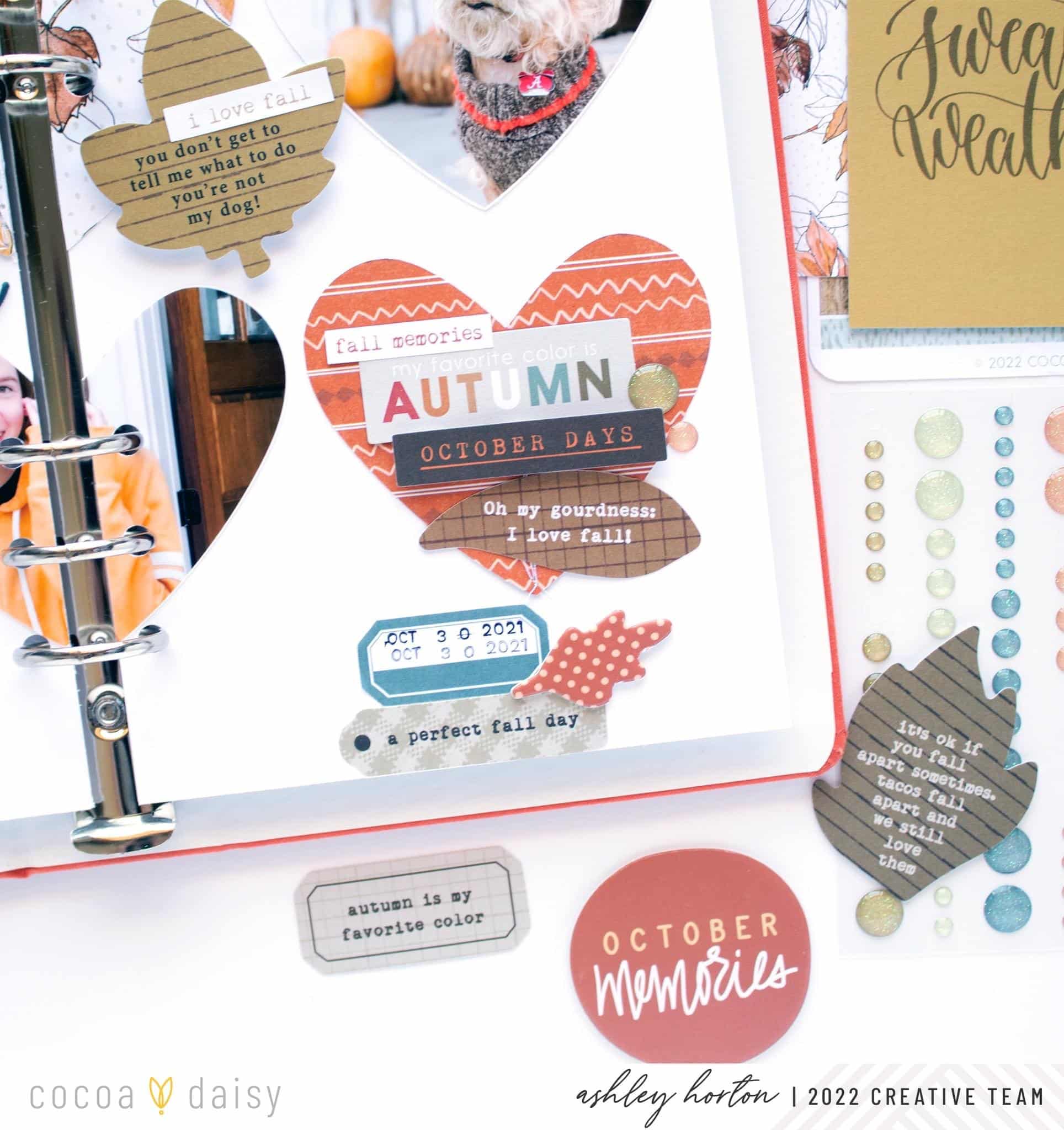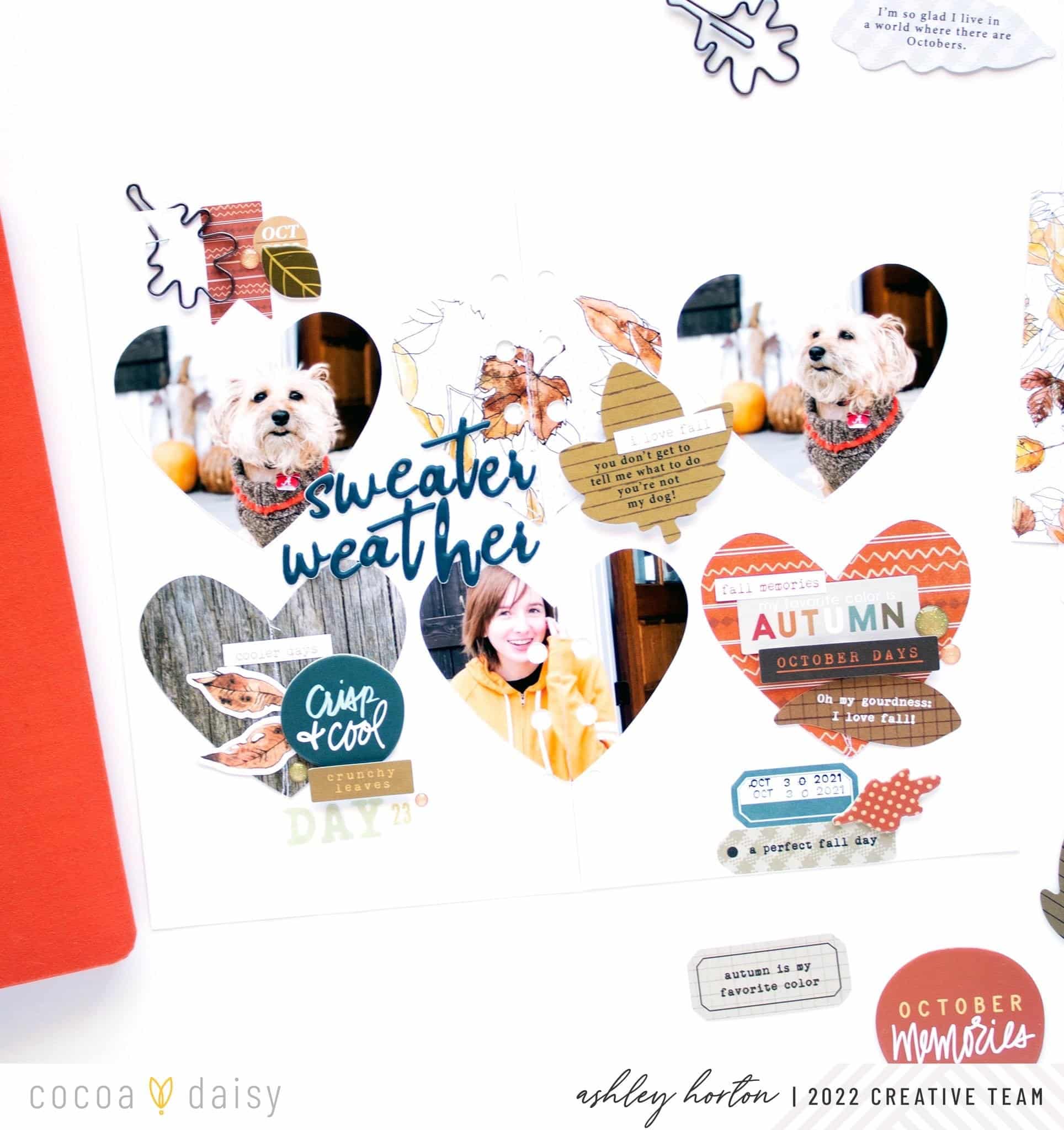 I decided to cut my photos and some of the patterned papers from the Autumn Thicket Modern Memory Keeping Kit into heart shapes. Then, I arranged them in a grid-style layout across both sides of my layout. I love a grid format using non-traditional shapes, and this style lets me have lots of space to add in some of the fun embellishments.