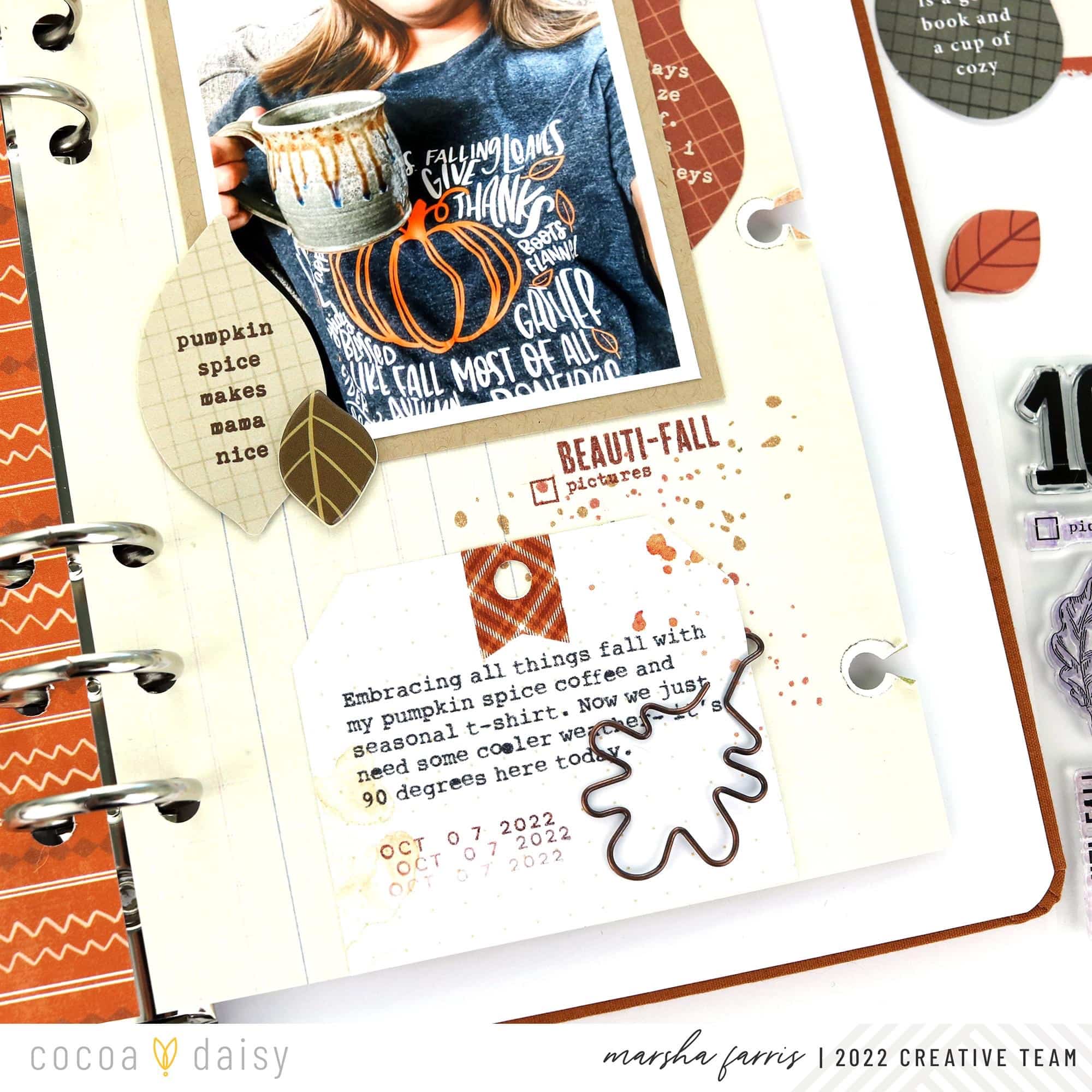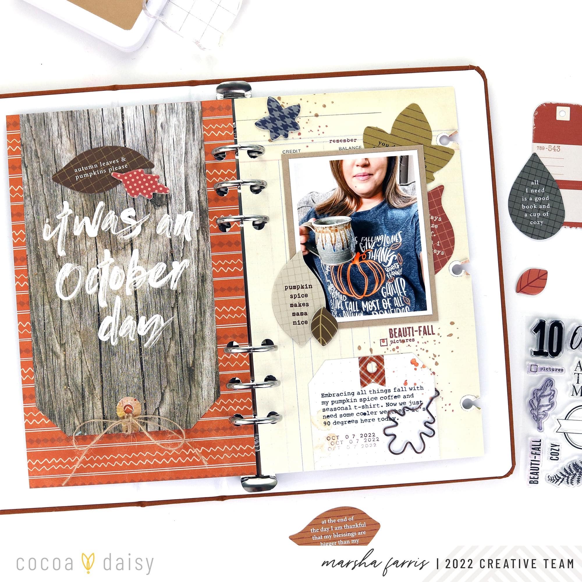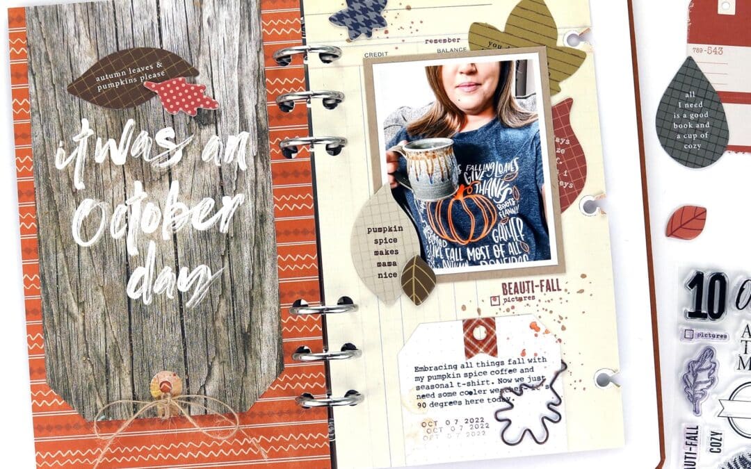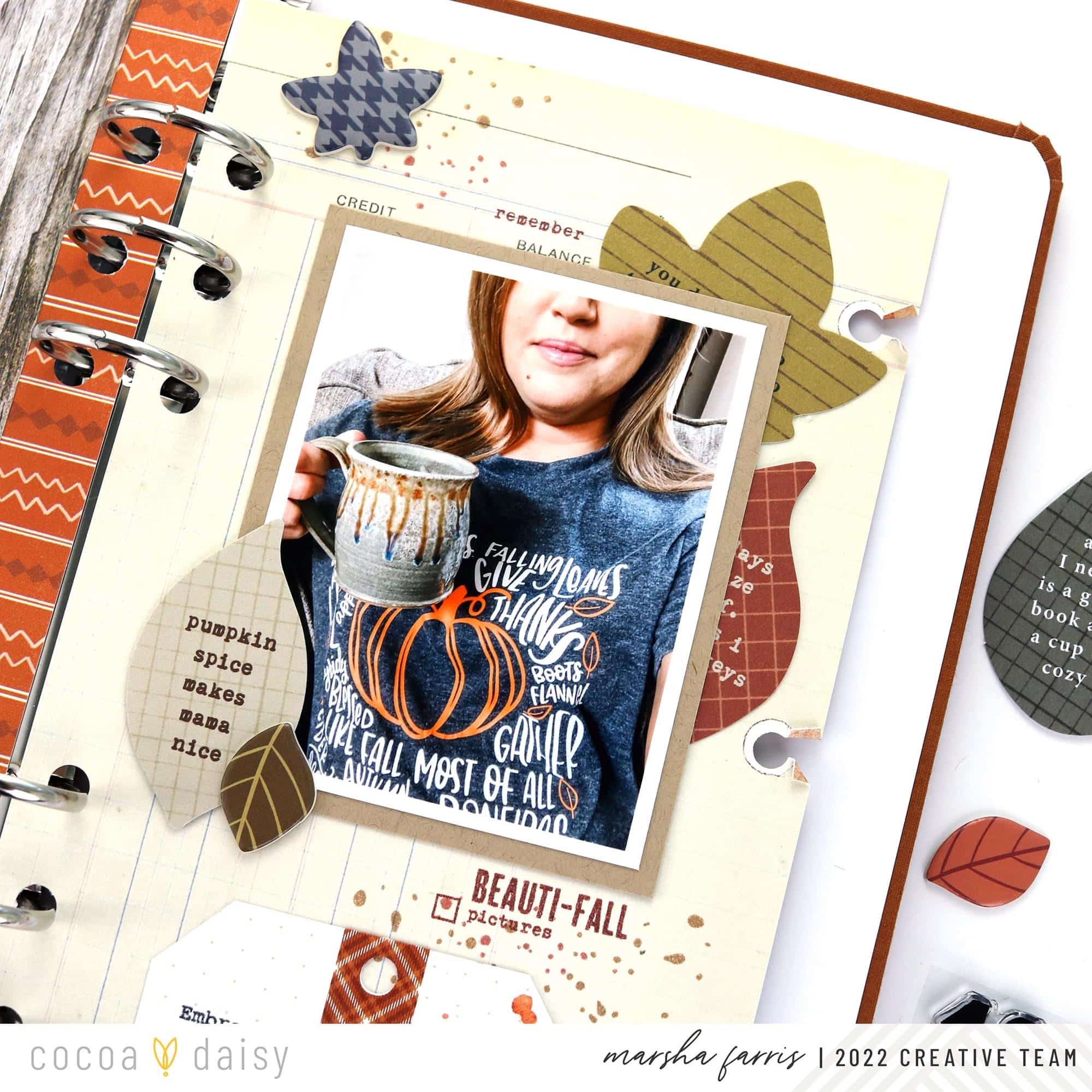 I create an October Daily album every year and enjoy documenting days throughout the month when I have fall or Halloween stories to tell. The Autumn Thicket Collection was perfect for this layout to document a recent photo of me wearing my fall t-shirt and enjoying a pumpkin spice coffee.