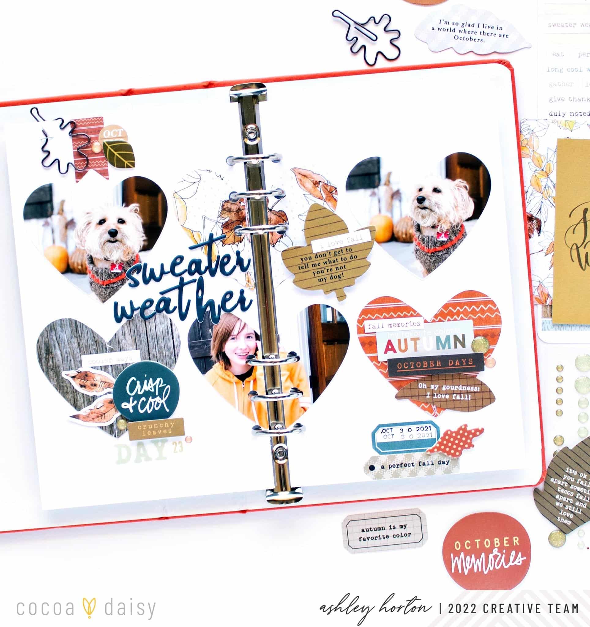 Daily documenting is fun, no matter what format you choose to work in! I am catching up on my October Daily from 2021, and I am up to Day 23. This layout was all about the sweater! It was finally cool enough to wear sweaters for the humans and for the doggie! I am glad I didn’t get to this page last year because the Autumn Thicket Collection was perfect for documenting these photos.