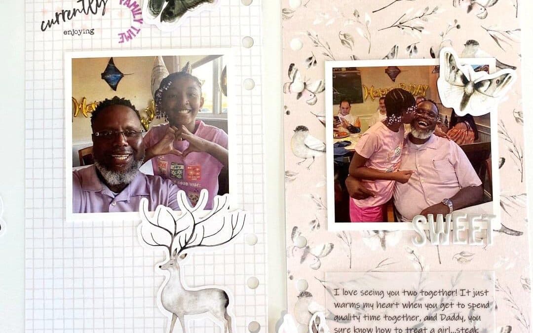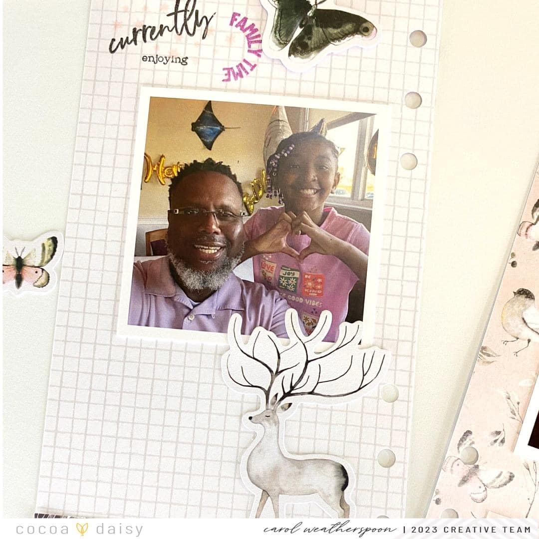 I used the beautiful grid paper for the left side of my spread along with a few die-cut pieces showcasing the gorgeous butterflies and deer. I added my photo in the middle of the spread and worked my way around the photo to keep your eye focused on the center of the layout.
