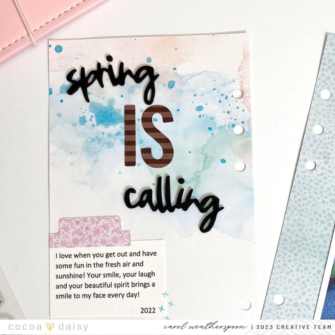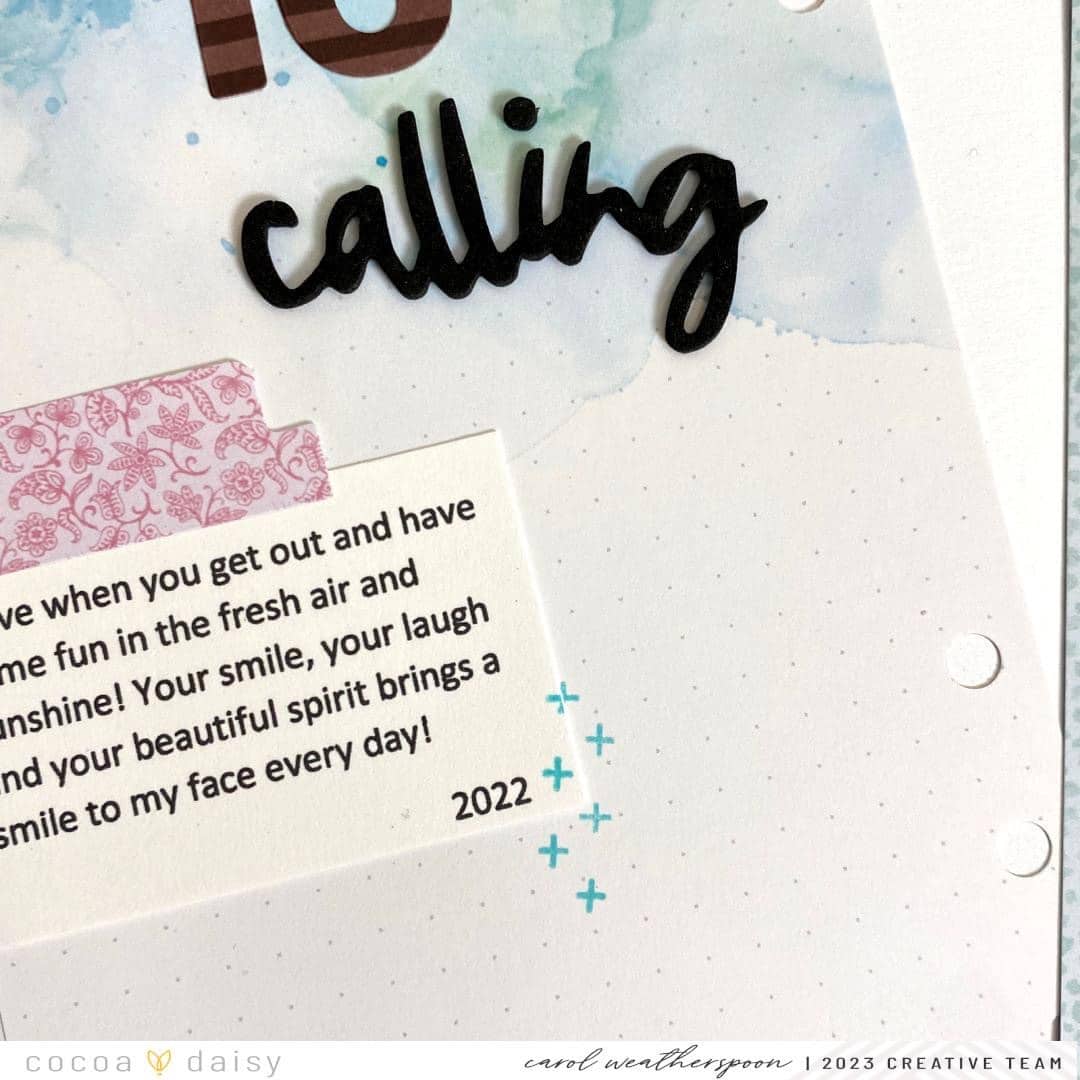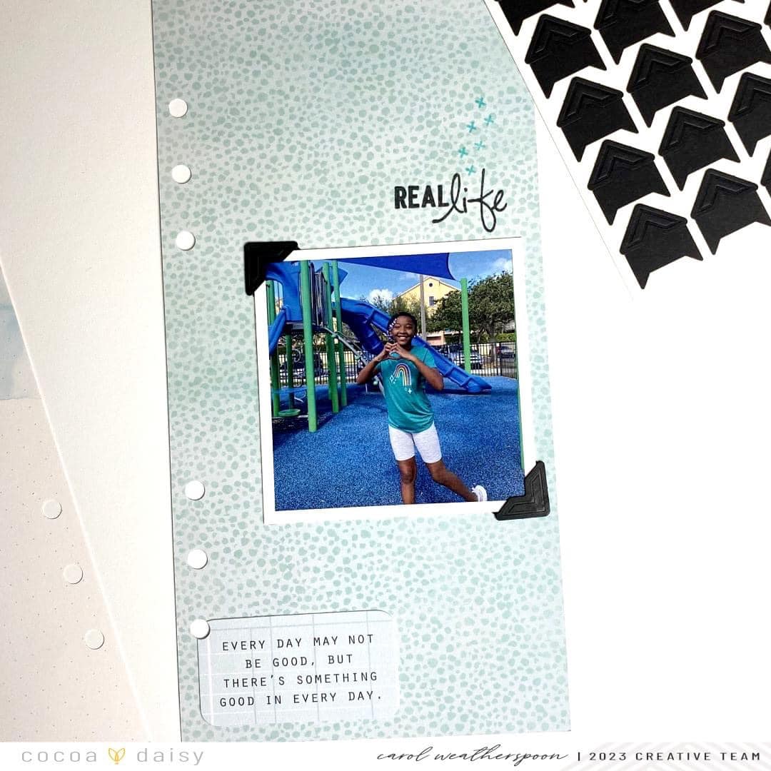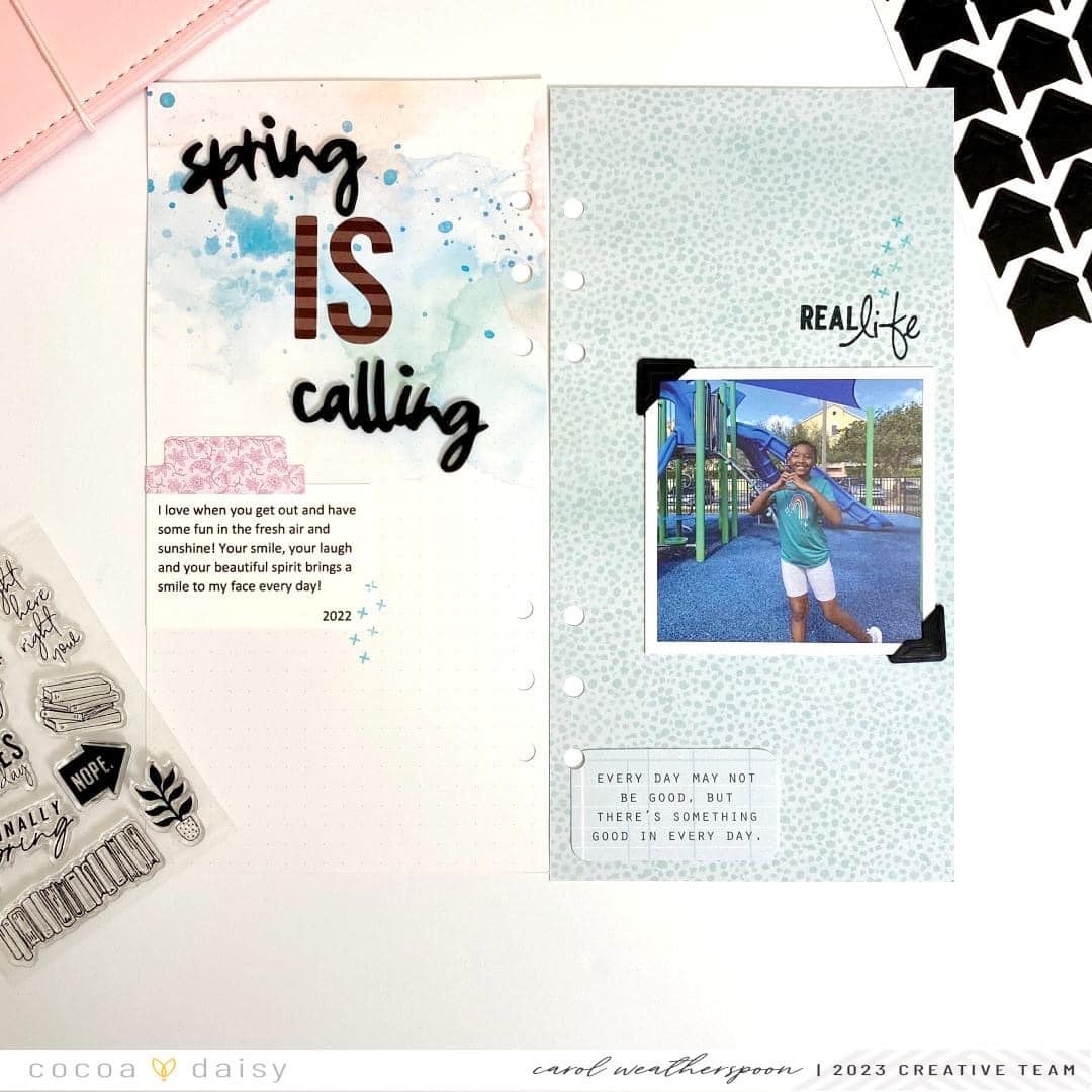 I love the beautiful watercolor look of the patterned paper from the Bookish Simple Dori and I added my title right on top in a diagonal pattern to draw your eye down the page. I then included my journaling and added a tab sticker and a little subtle stamping to complete my layout.