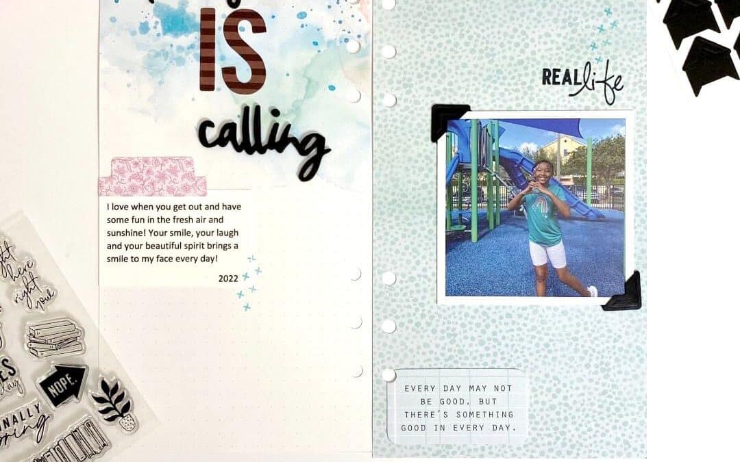 On the right side of the spread, I included my photo with a couple of photo corners from the Bookish Traveler’s Notebook Memory Keeping Kit near the center of the page. I then stamped a sentiment from the Bookish Memory Keeping Stamp Sets and the same stamp I used on the left side to complete my spread. I love how using basic elements can really pack a punch in your layout.