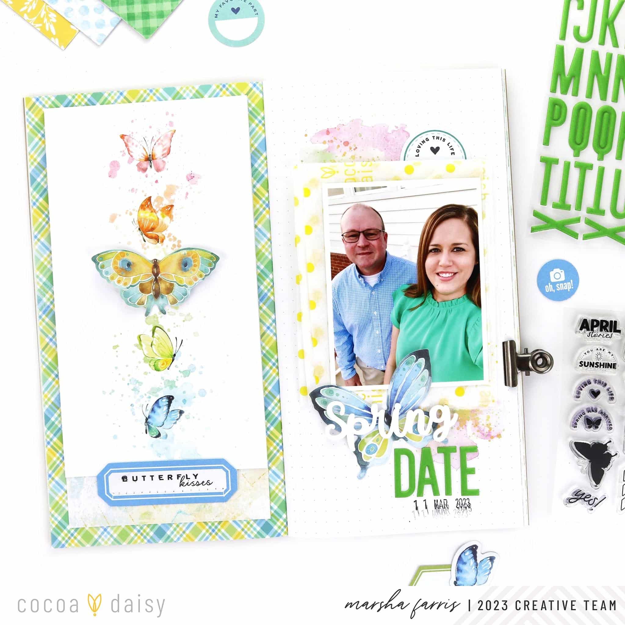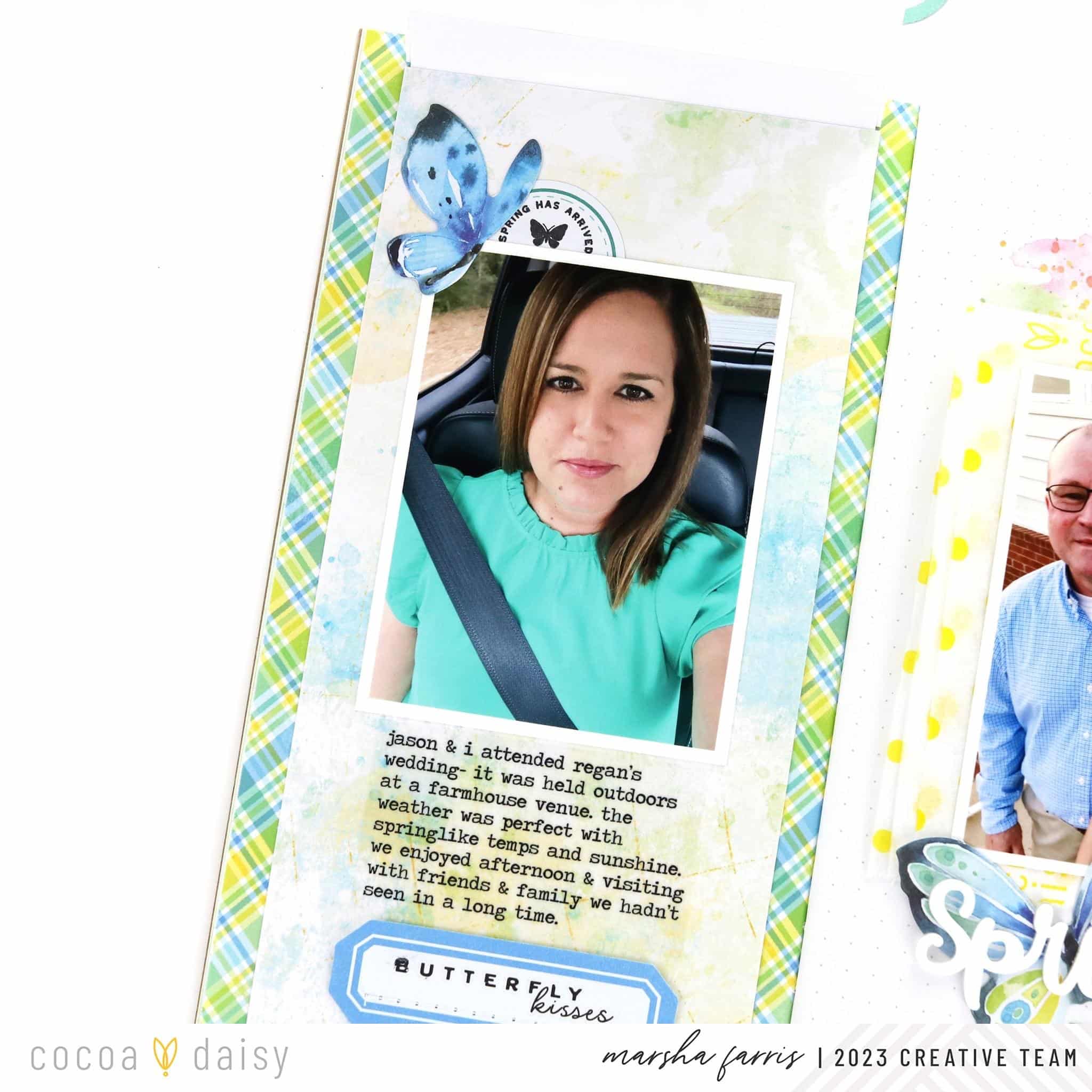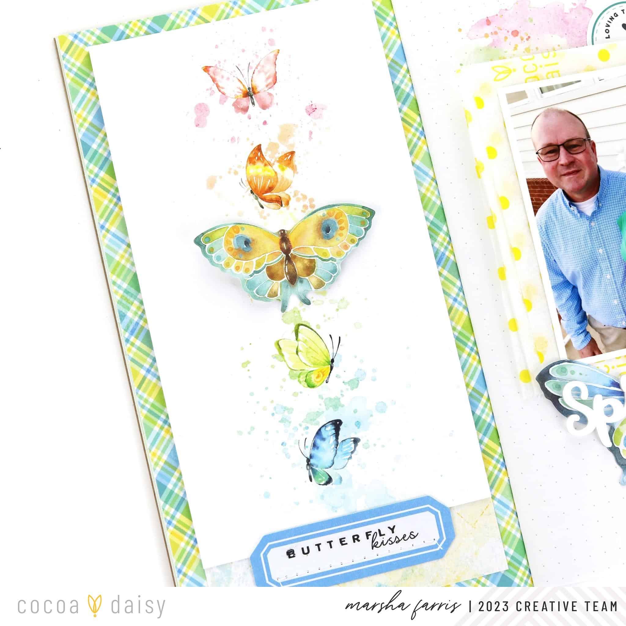 To begin the layout, I selected a spread in the Dandelion Wishes Simple Dori to use as a base for my design. I liked the springy plaid pattern in the notebook and thought the colors matched well with my photo. I love using Cocoa Daisy rub-ons and selected one that looked like watercolor to add around the edges of my picture. Next, I wanted to add some paper layers, so I folded a piece of yellow dot tissue paper from Cocoa Daisy packaging and added it behind my photo. Then, I created my title by layering a “spring” acrylic piece from the Dandelion Wishes Classified: Memory Keeping Edition over a die-cut butterfly and completed the title with puffy alphabet stickers.