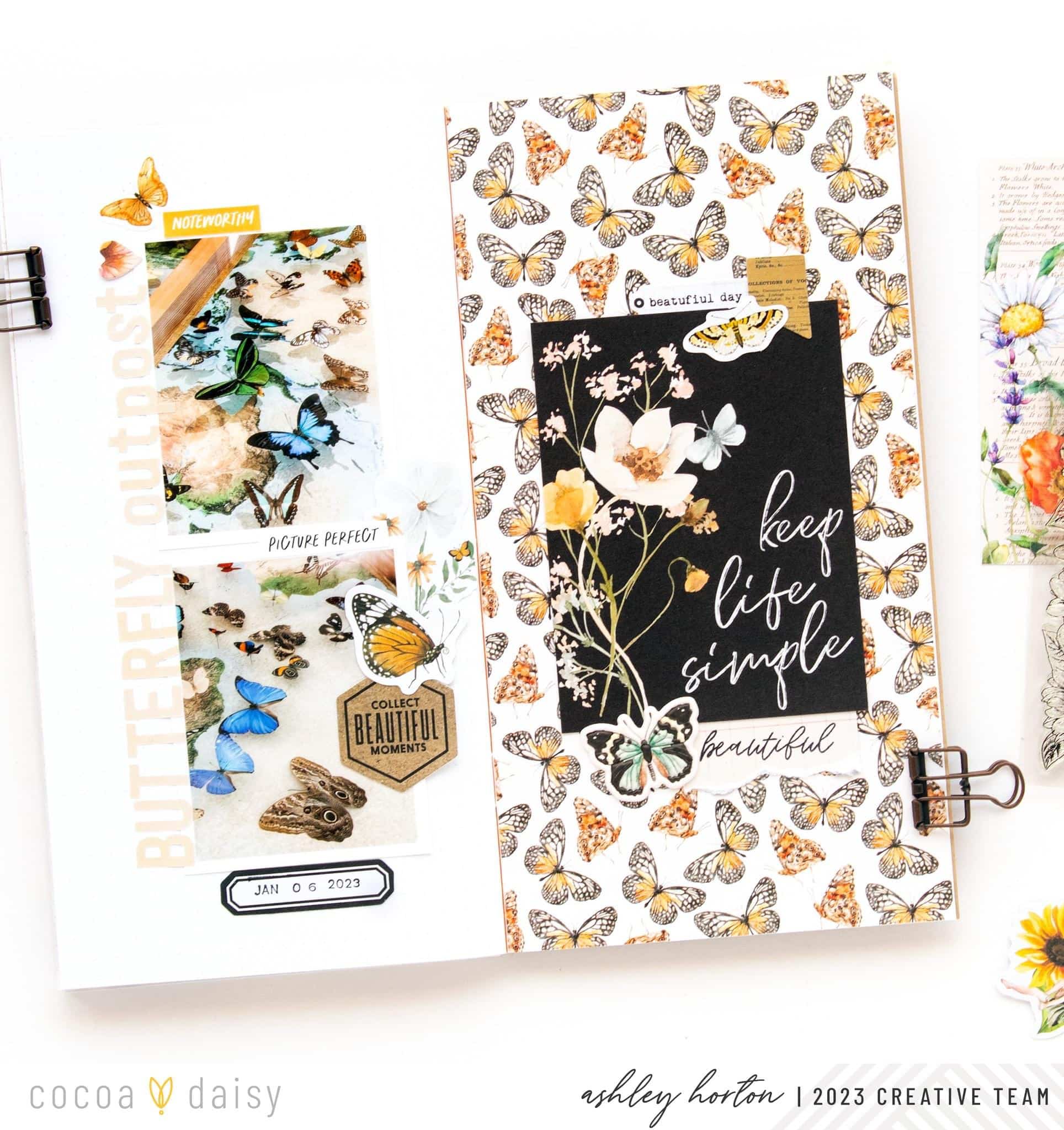 I started out as a 12×12 scrapbooker and I always thought I would stay with that size. But I have to admit, that now I really love the smaller Traveler’s Notebook size. And the Quiet Meadow Simple Dori in the Quiet Meadow Traveler’s Notebook Memory Keeping Kit makes it so easy to put a layout together. Everything is coordinated perfectly and it makes for quick and easy crafting. One of my favorite papers in the Quiet Meadow Traveler’s Notebook Memory Keeping Kit was definitely the butterfly background!!