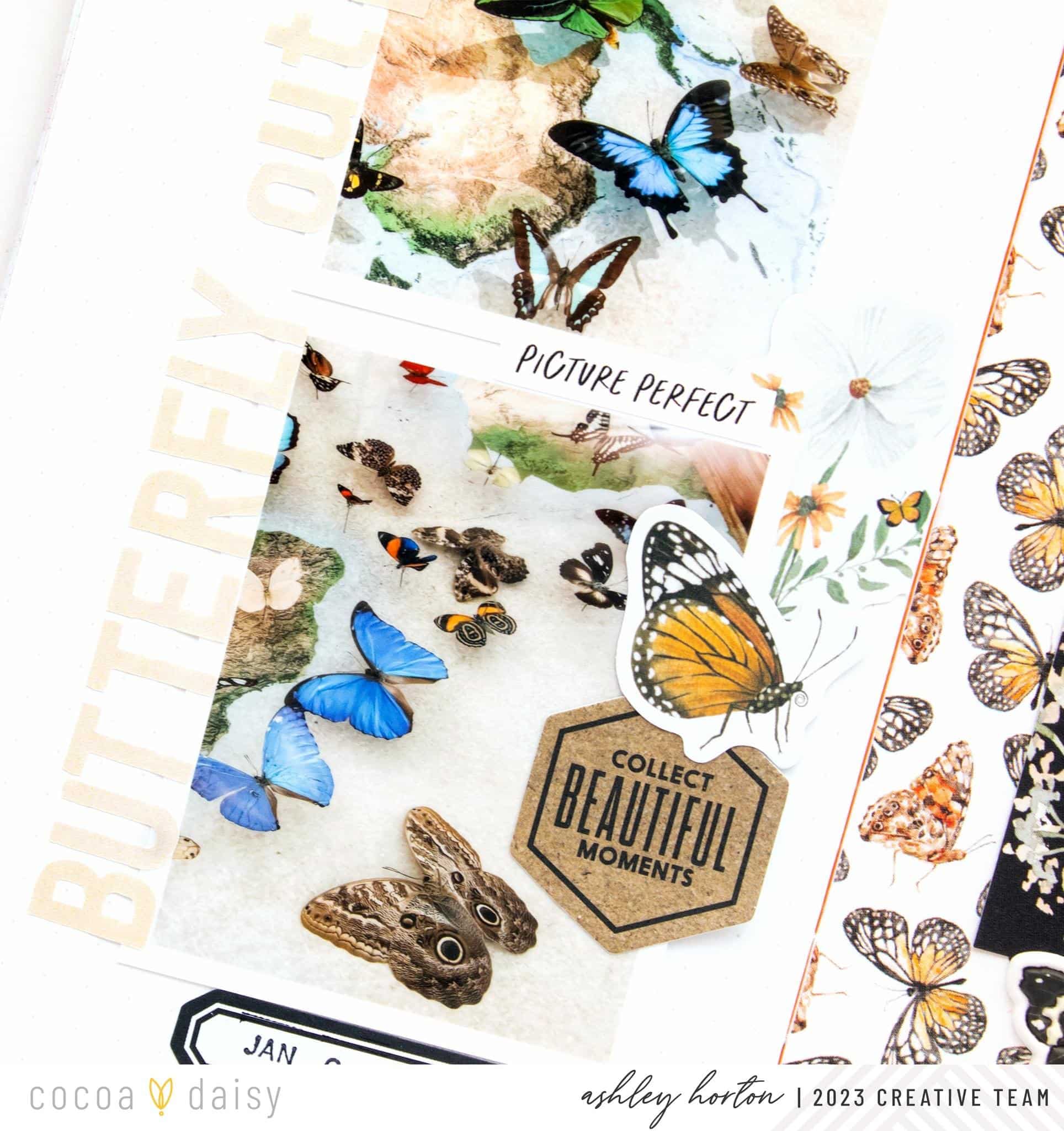 I had some photos from our local zoo, that I took in the butterfly house, and I wanted to document them with this paper. I printed two of my photos and placed them on the left-hand side of the layout. And then I used the alpha sticker from the Quiet Meadow Memory Keeping Sticker Kit to create the title for my page.