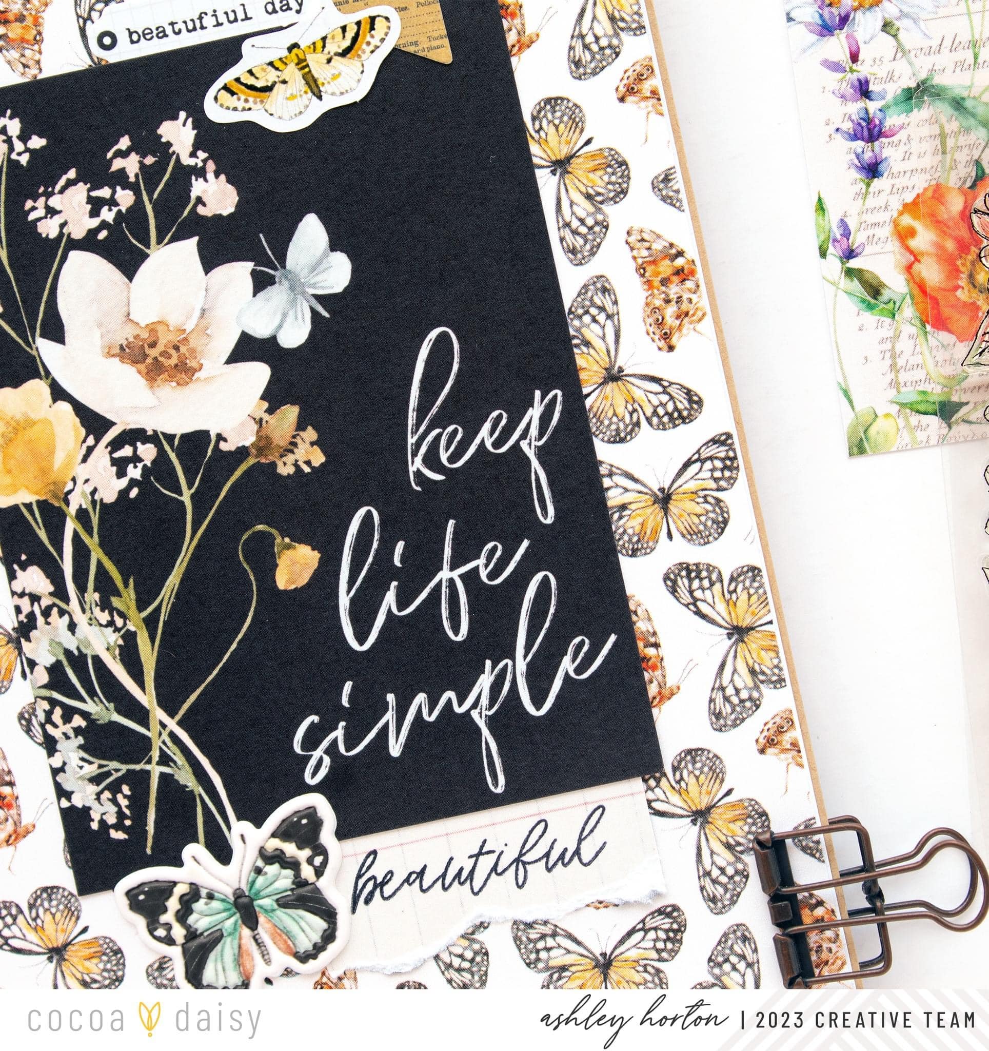 I wanted something that would stand out against the butterfly paper, so I chose this beautiful pocket card from the Quiet Meadow Modern Memory Keeping Kit. I love the contrast of the black against the butterflies. Then I finished off my layout with some of the embellishments from both kits.