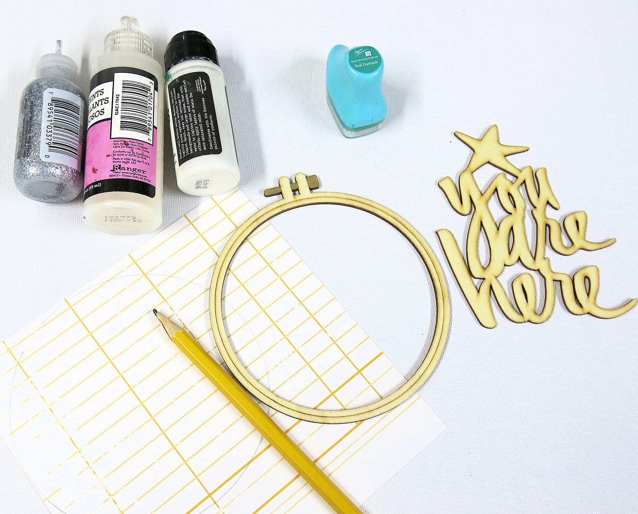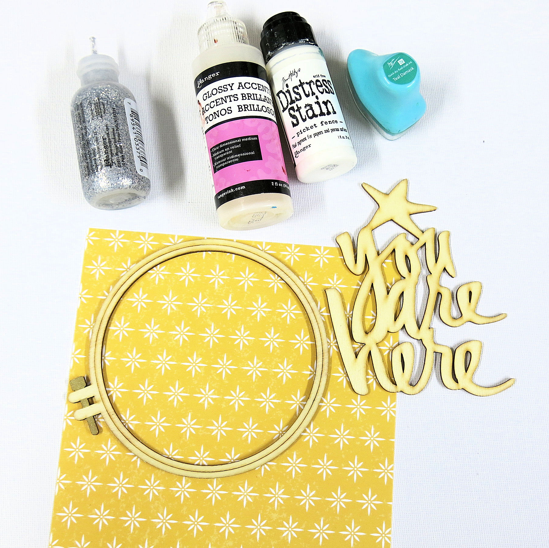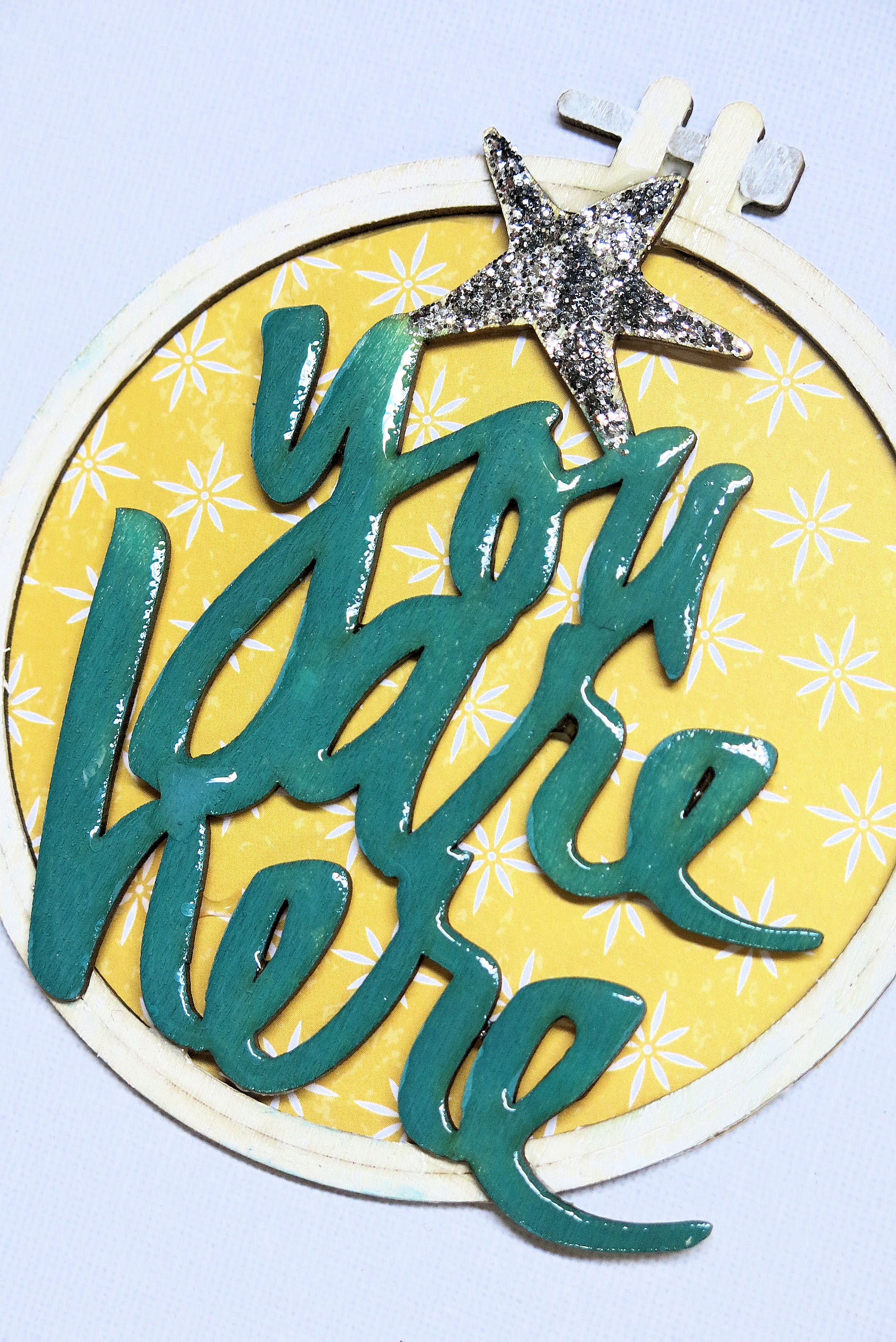 Although I love the colour, it looks flat. So once the wood veneer has been stuck in place on the hoop (using the same pva glue) I go over the words with glossy accents.