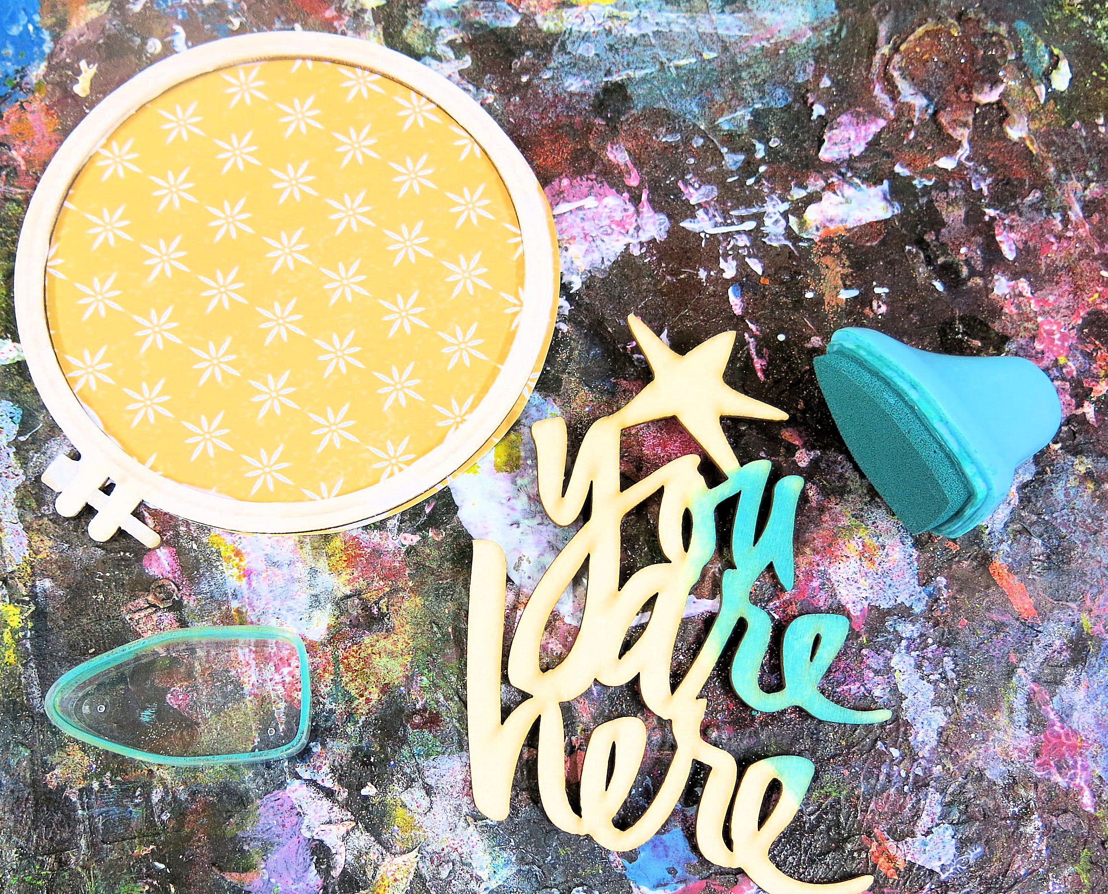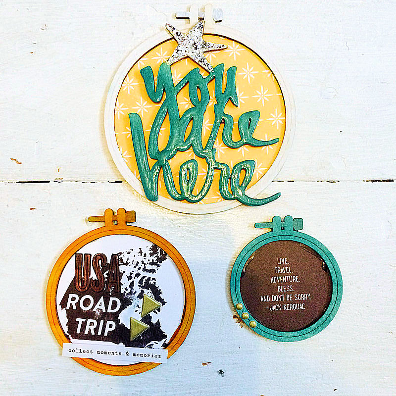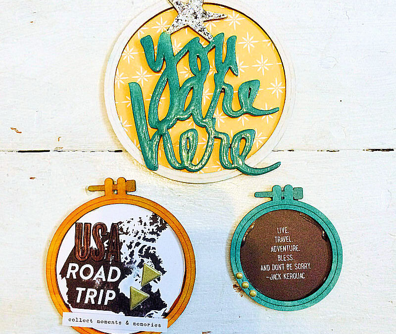 I went for the largest hoop first which measures about 4.5inches across. I picked out this cute Cocoa Daisy paper which comes as a 12×12 in the main kit or I took mine from the DITL kit which is a 6×6 and the Wood Veneer ‘You Are Here’ from Heidi Swapp is also in the DITL kit.