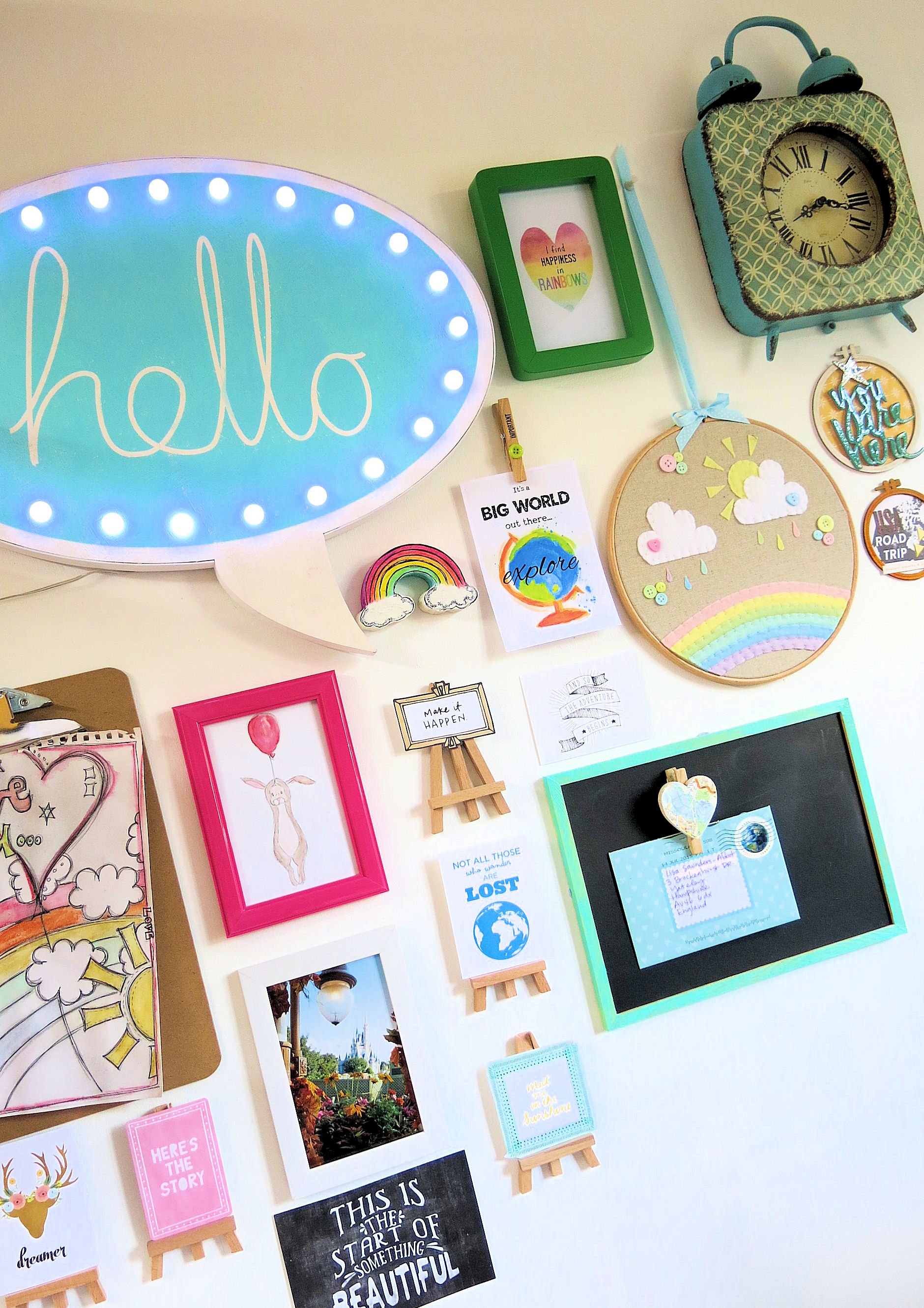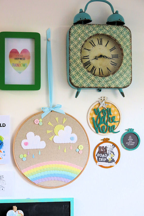 I’ve then decorated 2 of the smaller sized hoops from the same pack. I’ve used pieces from my DITL kit to decorate. The journal cards, alphas stickers and other stickers too. I love how they look on my wall. I’ve just used a small amount of blue tack top and bottom on each hoop to stick on the wall.