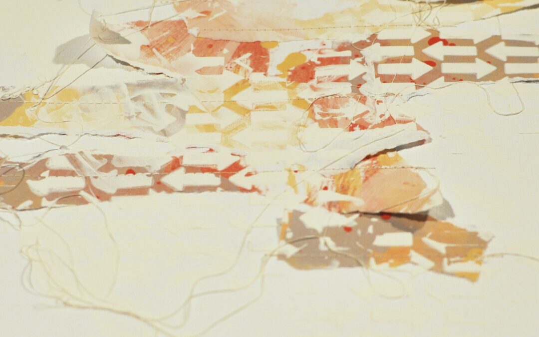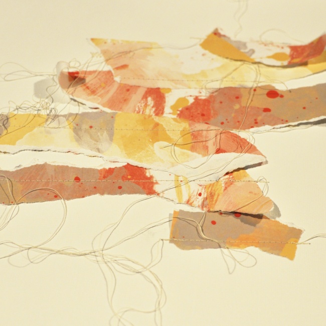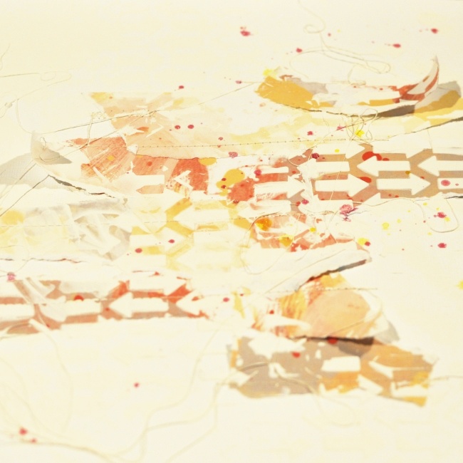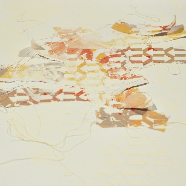Next, I added gesso on top of the papers and threads. I used a palette knife and a stencil and also smeared some of the gesso out outside of the stencil.