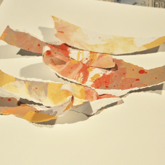 Hi there! I am sharing some tips and tricks on how to create a mixed media background today. I used a mix of the October and November kits. The first thing I did was to tear some pieces of the gorgeous paper that Stephanie designed for the October kit.