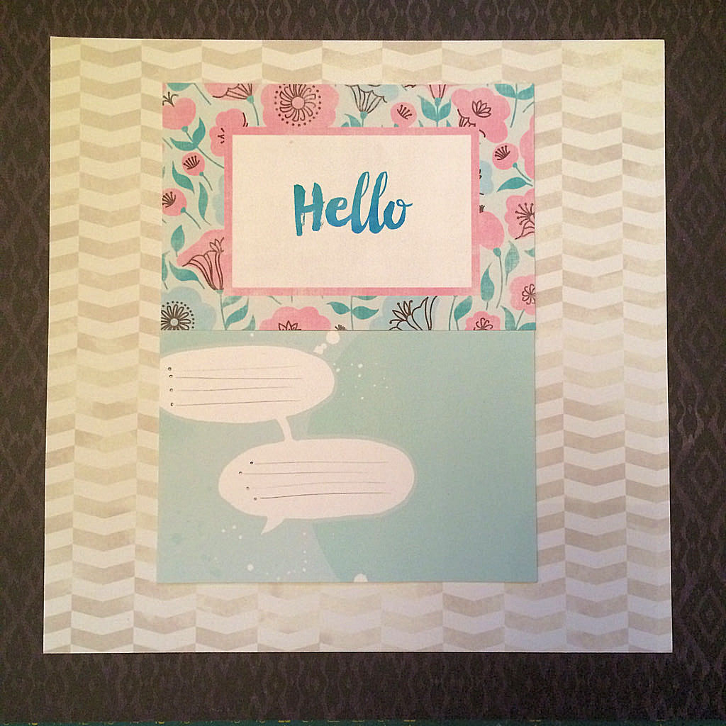 I started off with 2 pieces of patterned paper from the April main kit. I trimmed off around the edges of the inner piece and stuck down to create a frame. I took 2 journal cards from the April DITL Kit and stuck them together. The top will form part of my title and the lower card is perfect to document the conversation with those 2 speech bubbles.