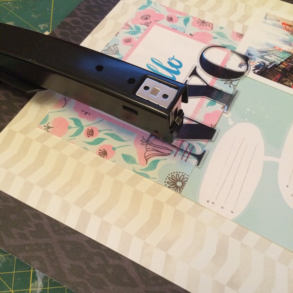 Totally loving the big alphas in the main kit, these were so perfect for my title. I used a little sticky tape to stick them in place and then added some fun pink staples. If you don’t have a long armed stapler, I really recommend one. I love using this on my projects.