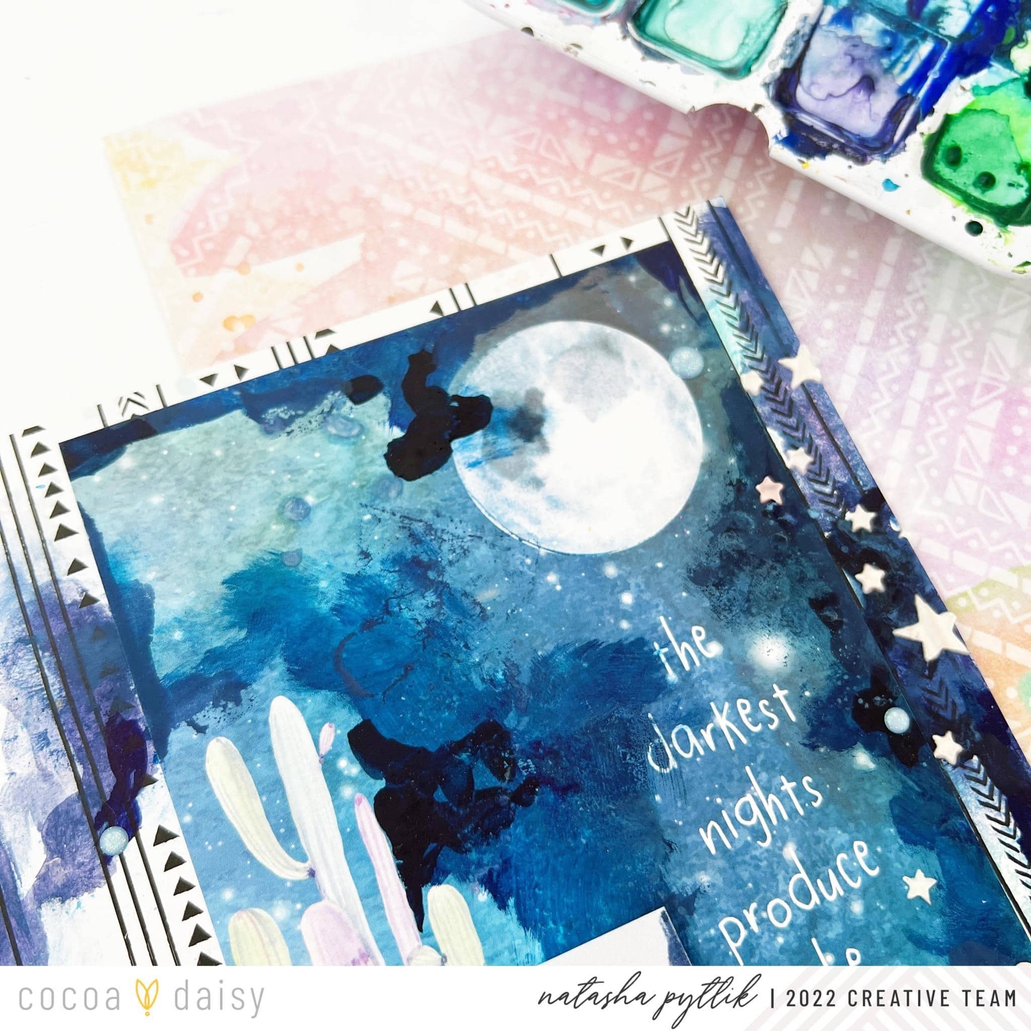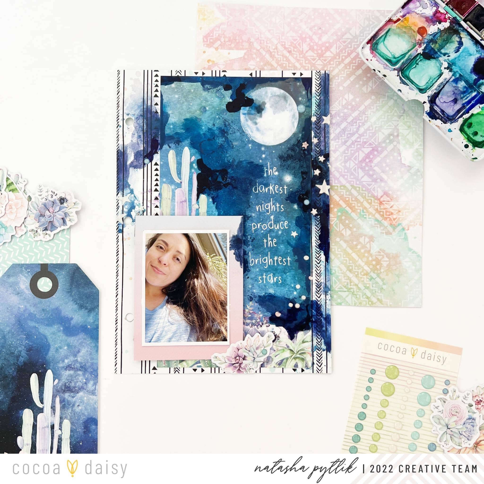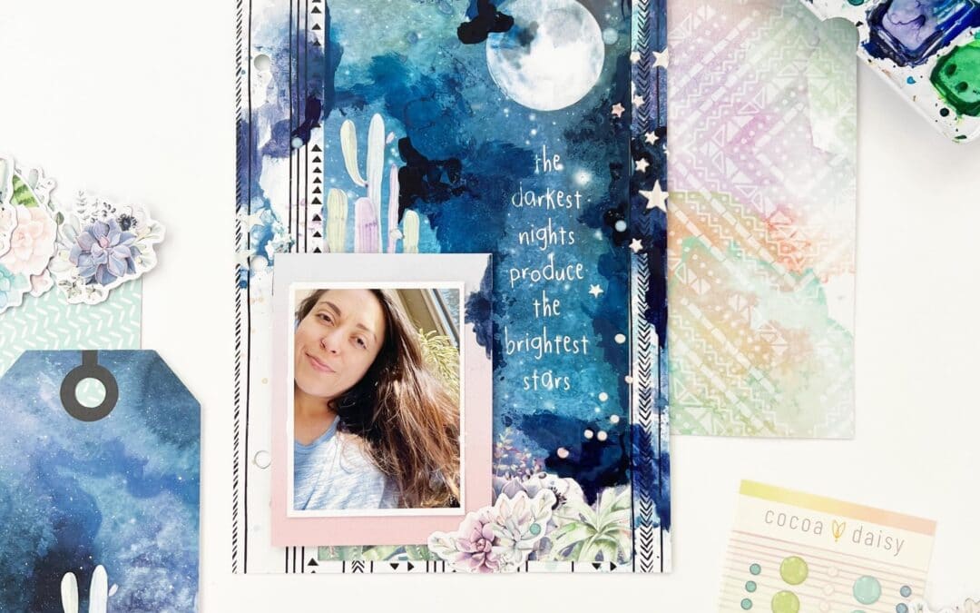 “In this project, I wanted to show contrast in a variety of ways- definitely through color which is vivid throughout this month’s collection with lots of moody deep blues and purples with the soft pinks and teals. Another way we can create contrast is through texture. Lastly, we can create contrast with the subject of a layout- this was the main reason I was drawn to the Traveler’s Notebook sized journal card from the Cactus Moon Traveler’s Notebook Memory Keeping Kit with the quote “the darkest night produce the brightest stars.”