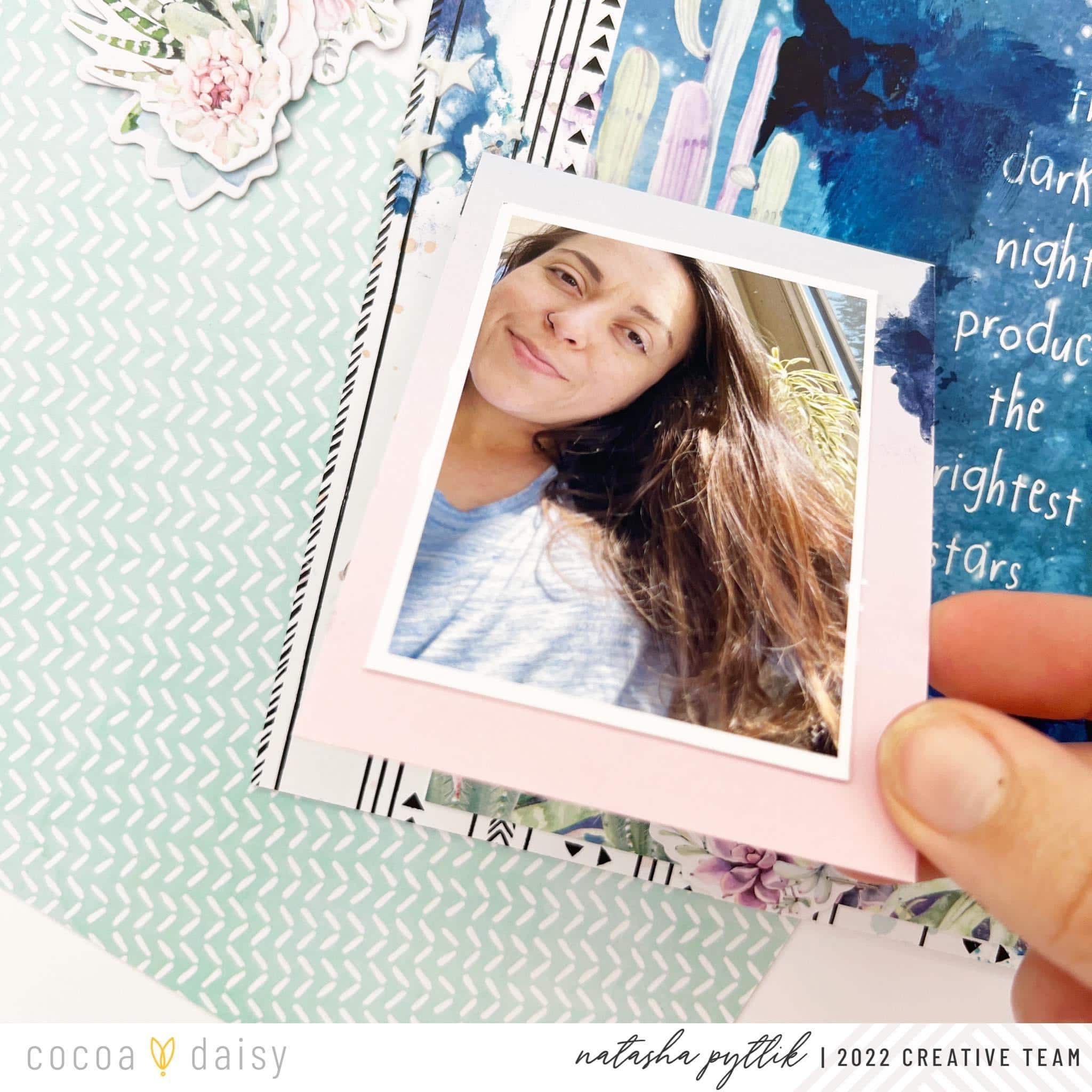 To finish off my project, I added a flip-up card that includes a selfie and a spot for hidden journaling on the other side of the card. I stapled the succulent art ephemera piece to my 6×8 sized patterned paper from the Cactus Moon Traveler’s Notebook Memory Keeping Kit to serve as a closure for my flip up- it tucks in so perfectly!