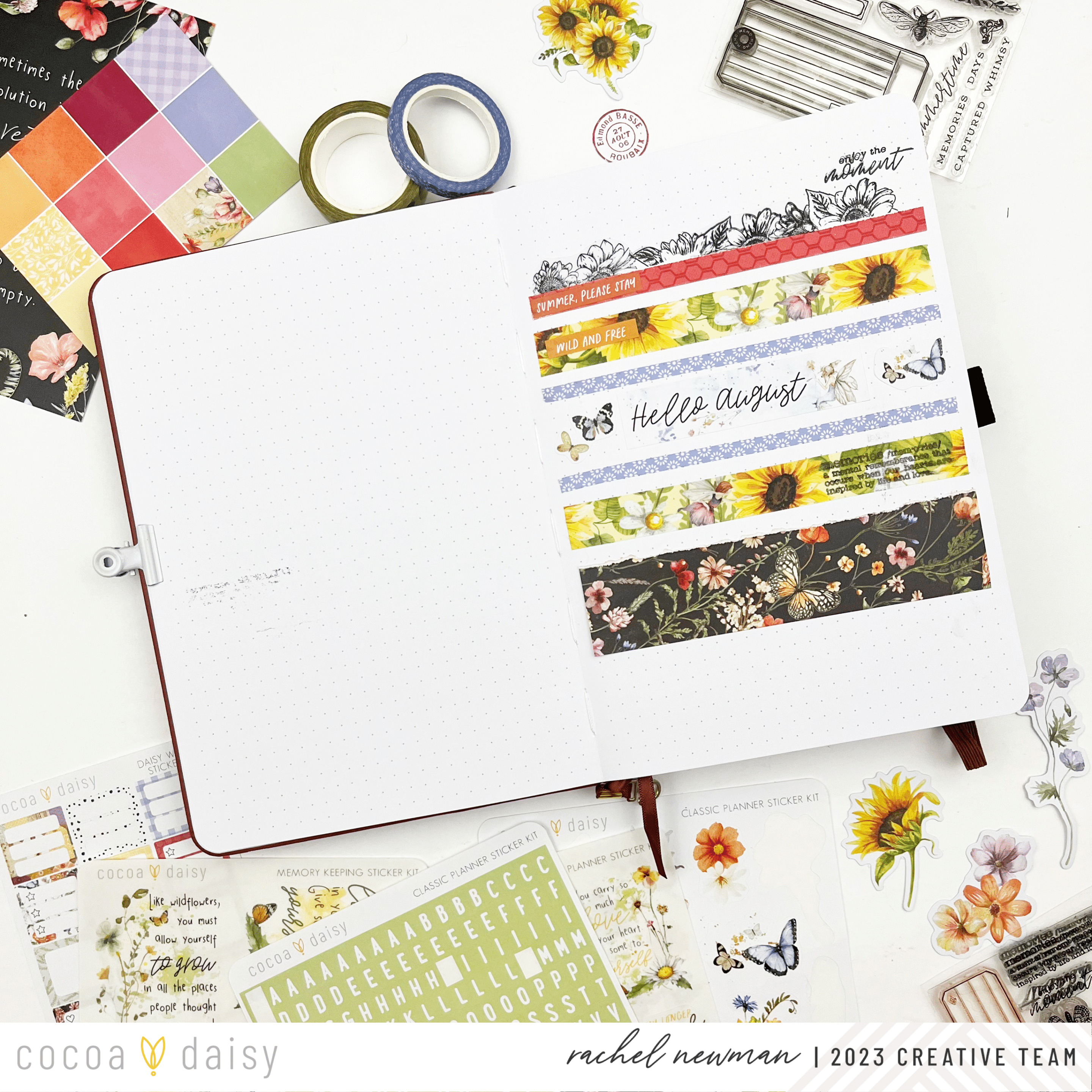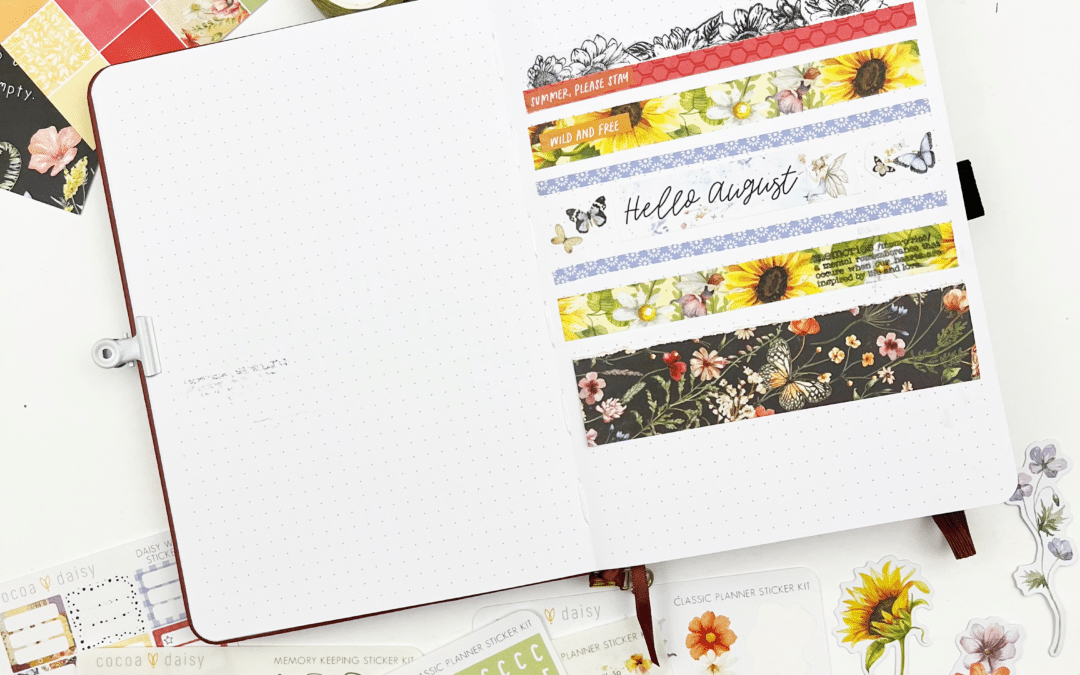 While the pattern papers from the collection are excellent, they are sometimes a little thick to use on planner spreads. On the other hand, the Quiet Meadow Simple Dori is flat and less thick, providing the perfect dimension for decorating your planner pages. Here, I decorated a monthly divider in this book-bound notebook. Using strips of paper from the Quiet Meadow Simple Dori like washi, I was able to pull several of the gorgeous patterns from the Quiet Meadow Collection and feature them on this spread.